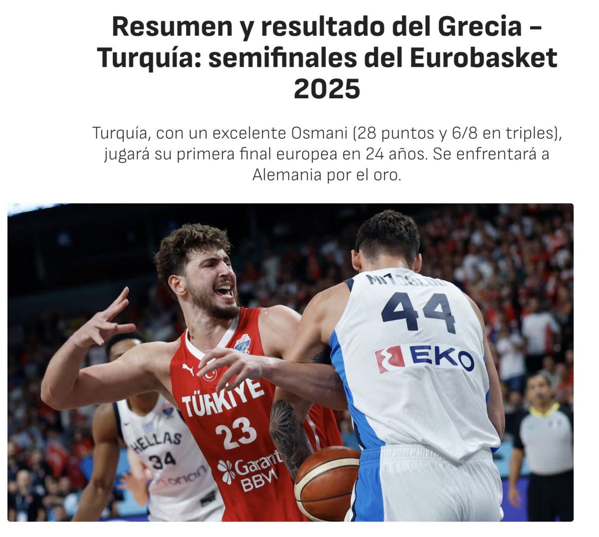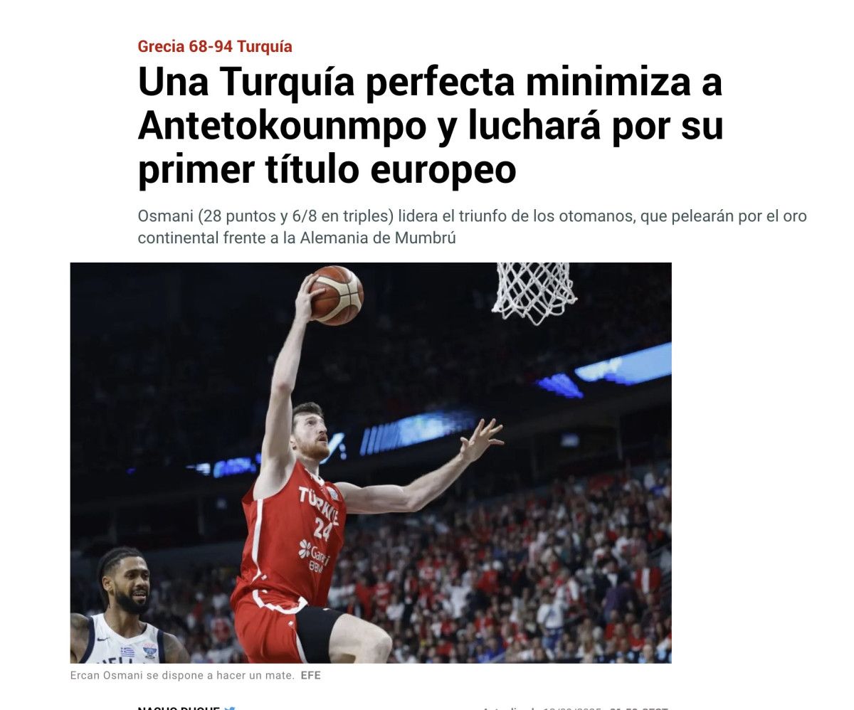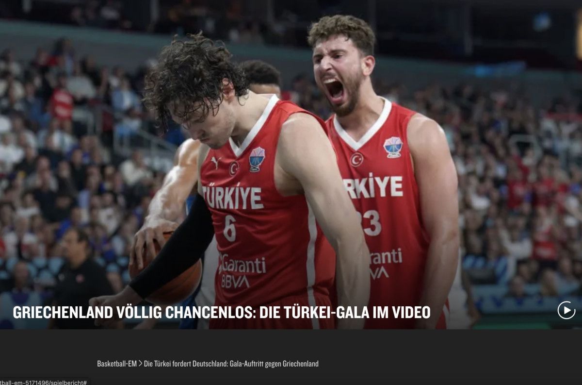 “Yunanistan’ın hiç şansı yoktu: Türkiye’nin muhteşem performansı. Yunanistan’ı 94:68’lik ikna edici bir skorla mağlup eden Türkiye, Basketbol Avrupa Şampiyonası finaline yükseldi.”