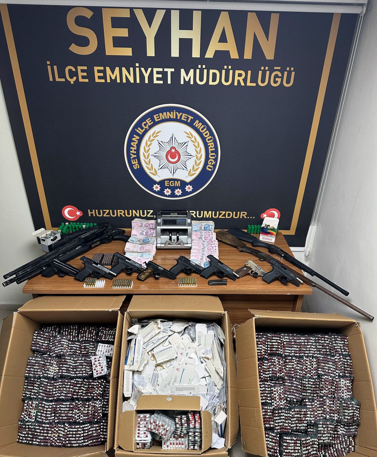 Ekipler, Serkan Ü.’nün iş yerindeki aramada 1’i kurusıkı 8 ruhsatsız tabanca, 4 ruhsatsız av tüfeği ile 300 mermi, 54 bin 265 uyuşturucu hap, suçtan elde edildiği değerlendirilen 499 bin 150 lira ile para sayma makinesi ele geçirdi.