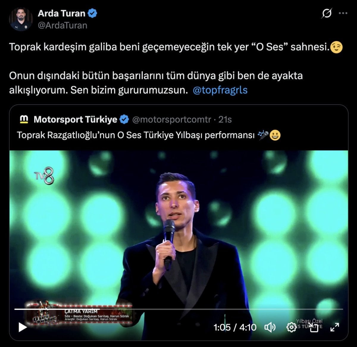 Turan, paylaşımında Razgatlıoğlu’nun O Ses Türkiye Yılbaşı performansını alıntıladı.