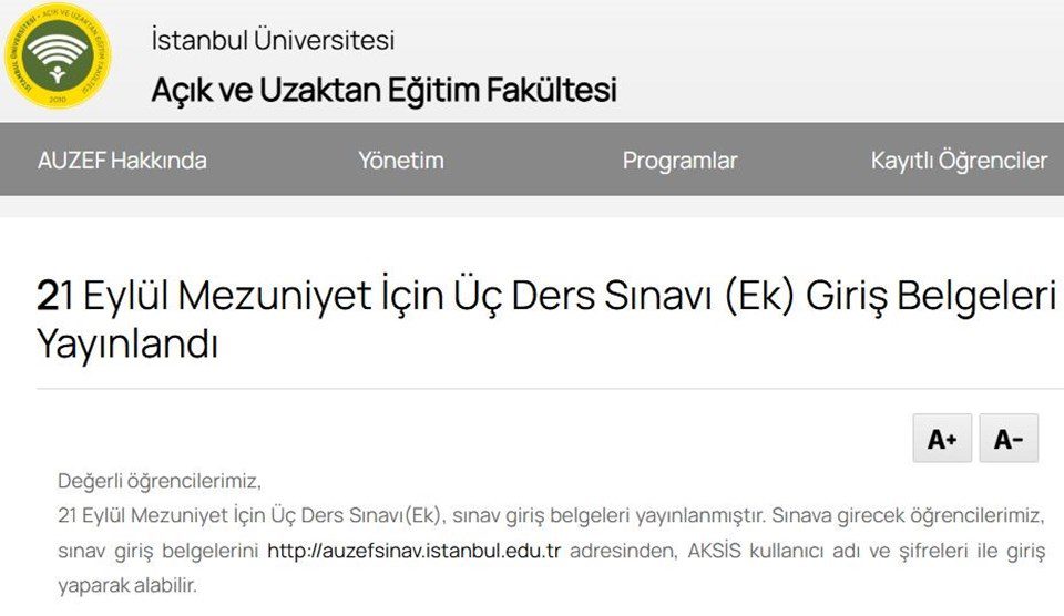 21 Eylül Mezuniyet İçin Üç Ders Sınavı(Ek), sınav giriş belgeleri yayınlanmıştır. Sınava girecek öğrencilerimiz, sınav giriş belgelerini http://auzefsinav.istanbul.edu.tr adresinden, AKSİS kullanıcı adı ve şifreleri ile giriş yaparak alabilir.” denildi.