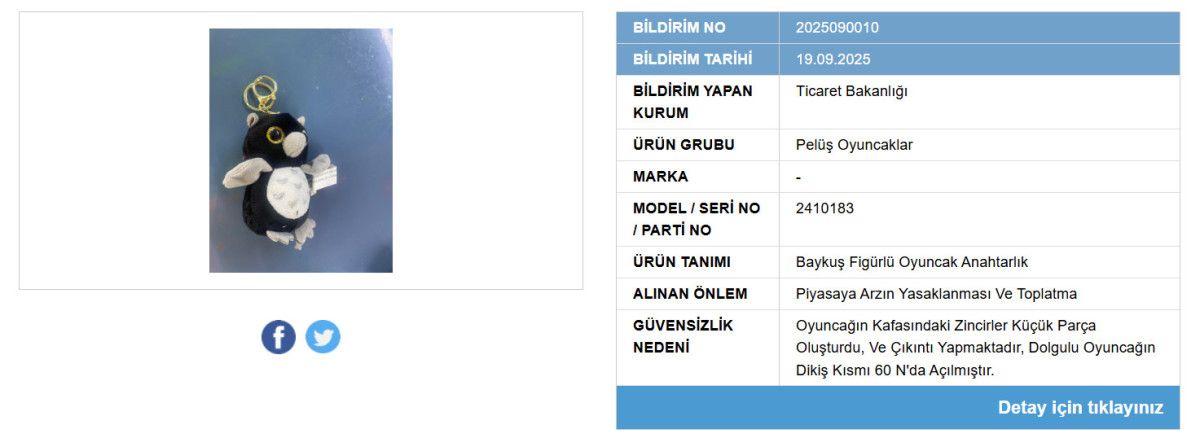 Bakanlık söz konusu oyuncak hakkında yaptığı duyuruda, “Oyuncağın Kafasındaki Zincirler Küçük Parça Oluşturdu, Ve Çıkıntı Yapmaktadır, Dolgulu Oyuncağın Dikiş Kısmı 60 N’da Açılmıştır.” ifadeleri kullanıldı.