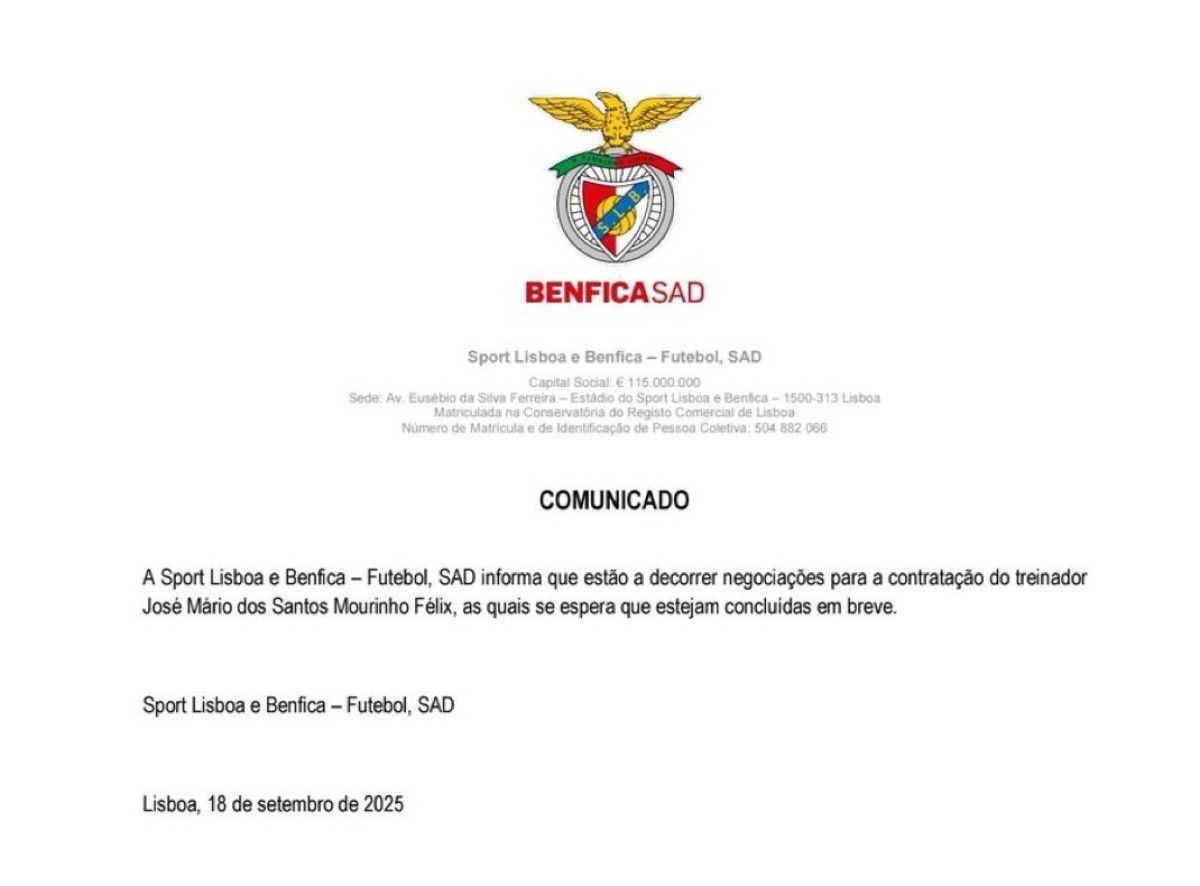 Buna göre Mourinho, Benfica ile 2 yıllık sözleşme imzalayacak.