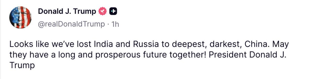 Paylaşımda, Trump, son dönemde Hindistan, Rusya ve Çin arasındaki güçlenen işbirliğine yönelik, “Görünüşe bakılırsa Hindistan ve Rusya’yı en karanlık ve derin Çin’e kaptırdık.