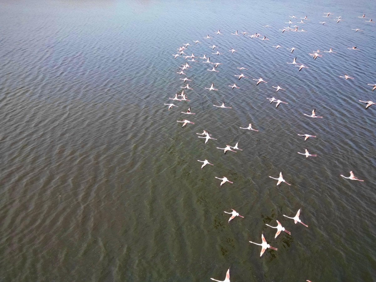 Eber Gölü’nün Bolvadin ilçesi sınırlarında kalan bölümünde toplanan flamingolar, havadan dron ile görüntülendi. Göl yüzeyinde toplu halde süzülen sürü, kartpostallık manzaralar oluşturdu.