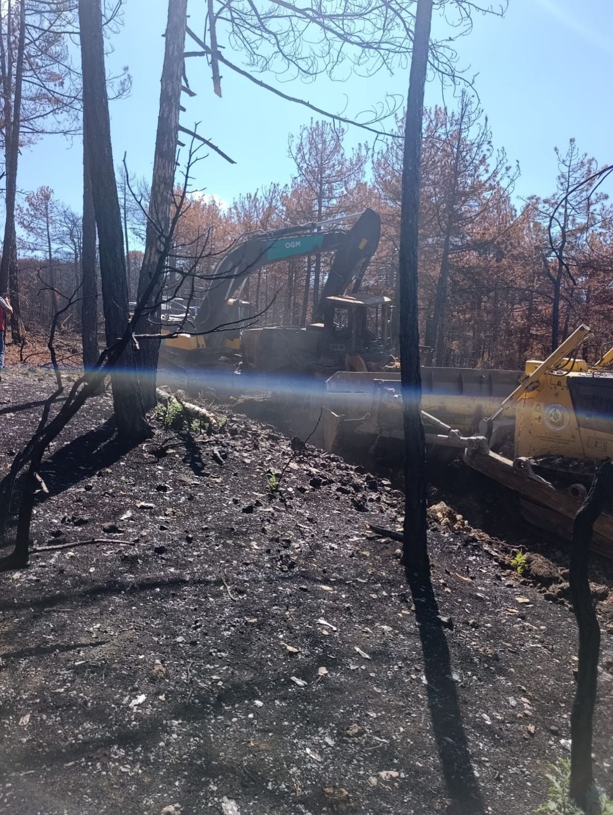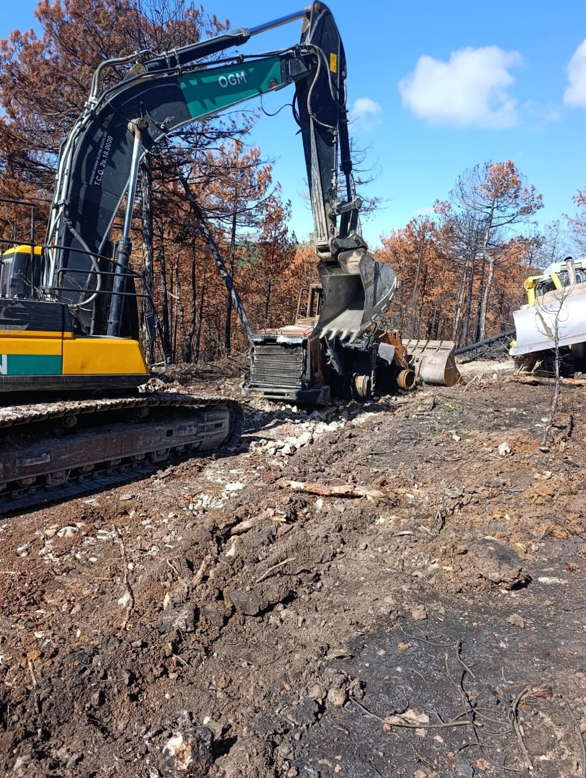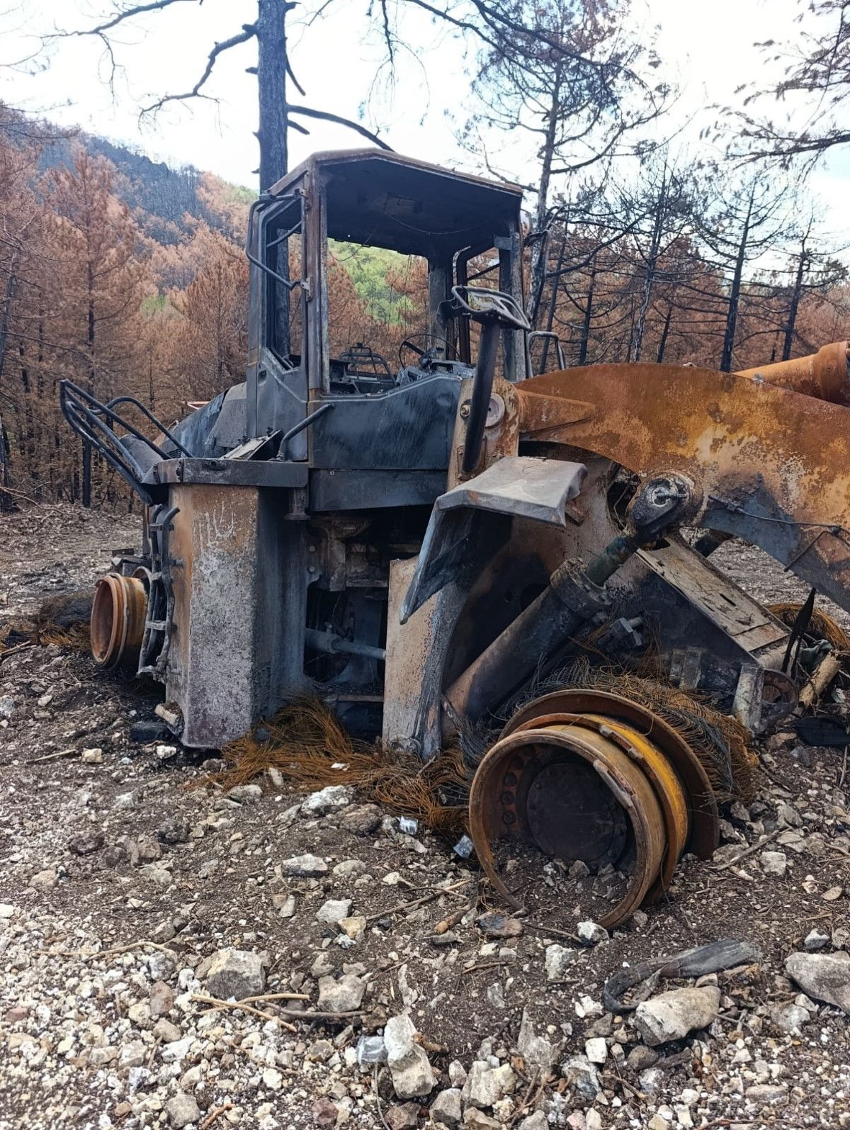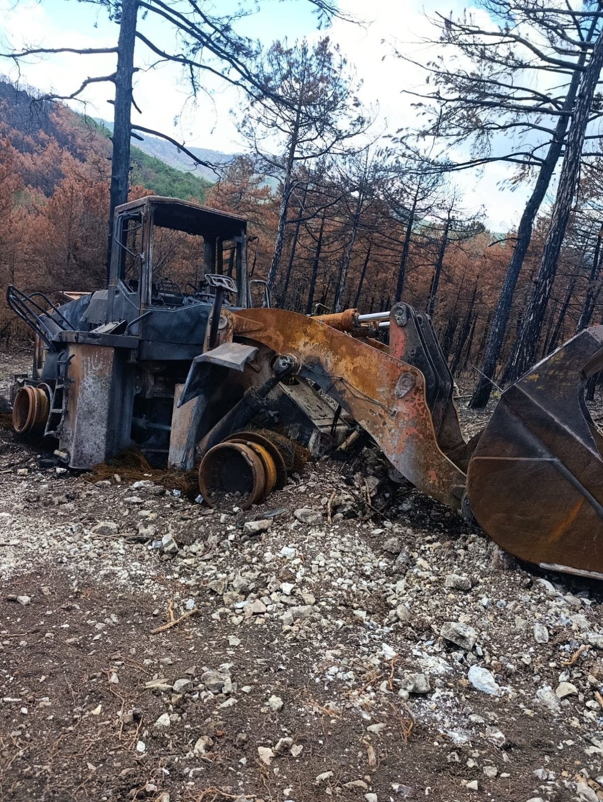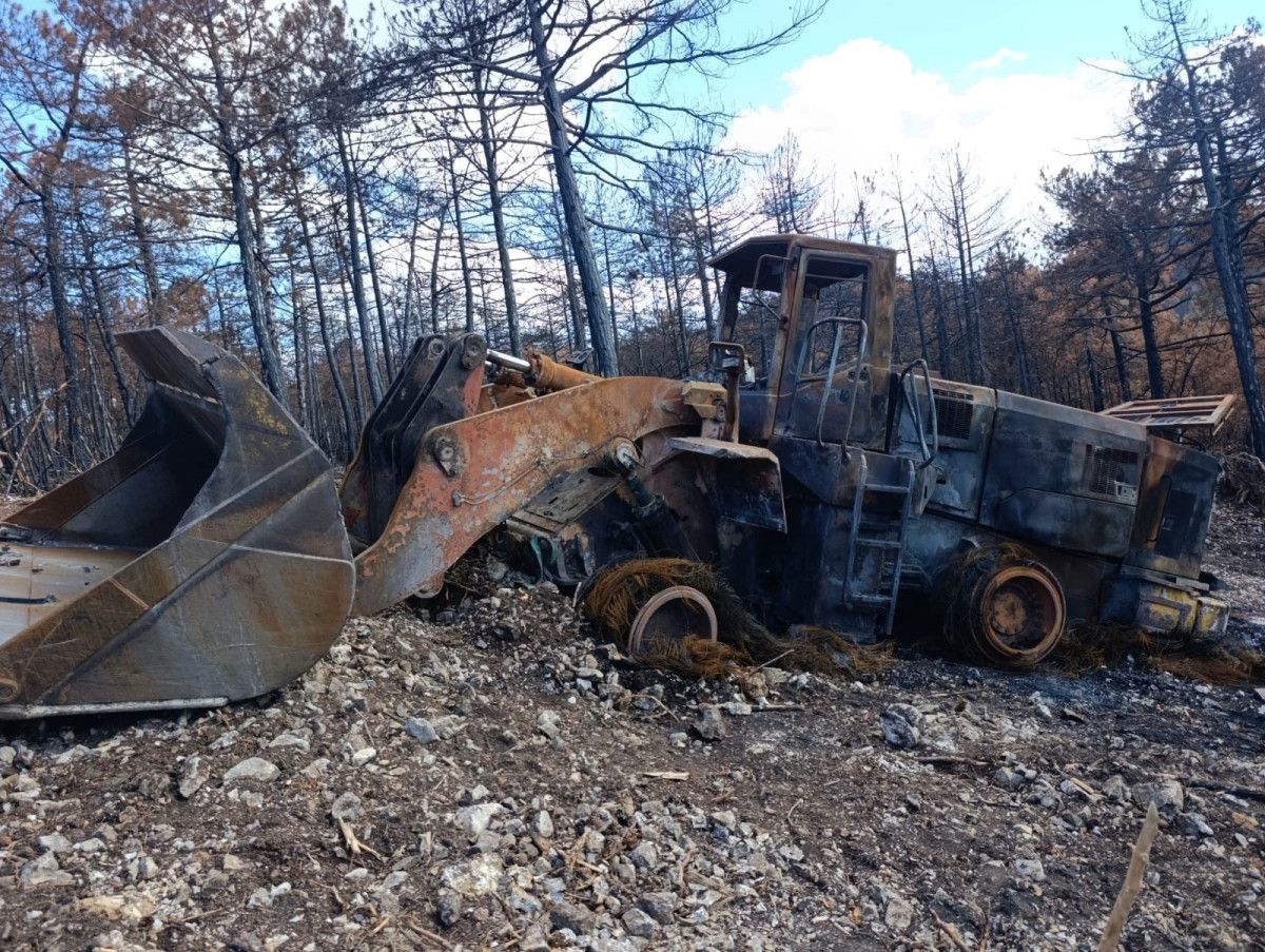 Yangınlarda ekiplerin kullandığı arazözler ve iş makinaları da adeta küle dönmüştü.