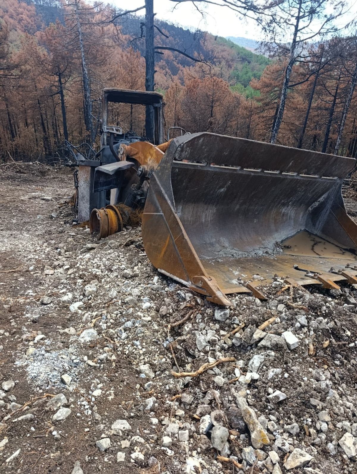 Tonlarca ağırlıktaki iş makinesinin küle dönmüş hali ise yangının boyutunu bir kez daha gözler önüne seriyor.