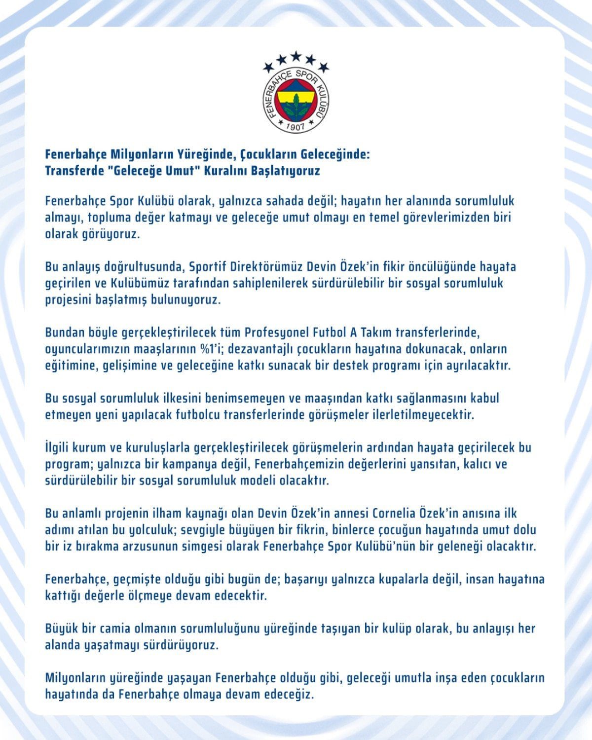 Bundan böyle gerçekleştirilecek tüm Profesyonel Futbol A Takım transferlerinde, oyuncularımızın maaşlarının yüzde 1’i; dezavantajlı çocukların hayatına dokunacak, onların eğitimine, gelişimine ve geleceğine katkı sunacak bir destek programı için ayrılacaktır.