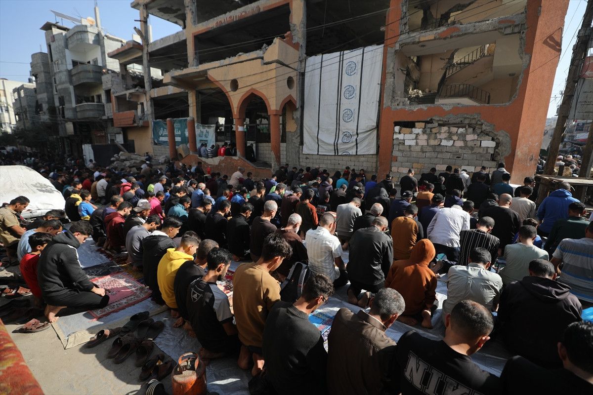 Filistinliler, İsrail saldırıları sonucu hasar gören Faruk Camii’nde ve çevresinde saf tuttu.