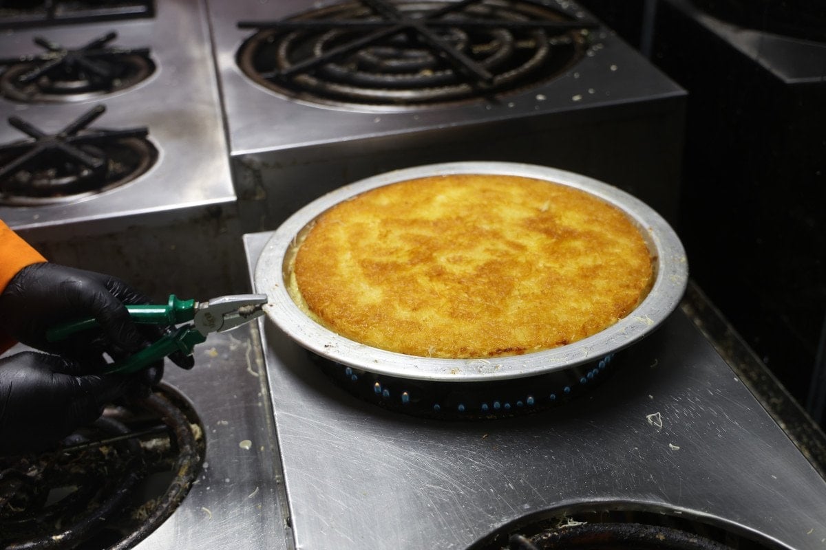 Down sendromlu Mehmet’in yaklaşık 6 aydır yanında çıraklık yaptığını söyleyen künefe ustası Müslüm Günal, “Ben yaklaşık 20 yıldır künefe ustasıyım ve 15 yıldır ise işletme sahibiyim. Künefe yapmayı aileden öğrendim. Künefenin içinde; kadayıf, yöreye ait tuzsuz peynir ve tereyağı kullanılır.