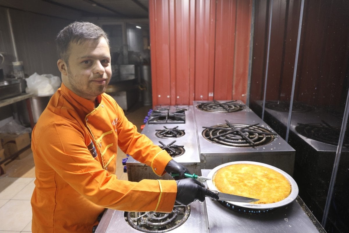 Künefe yemek için Müslüm Usta’yı tercih eden 21 yaşındaki down sendromlu Mehmet Doğru, her gün künefe yediği işyerine 6 ay önce çırak olarak başladı.