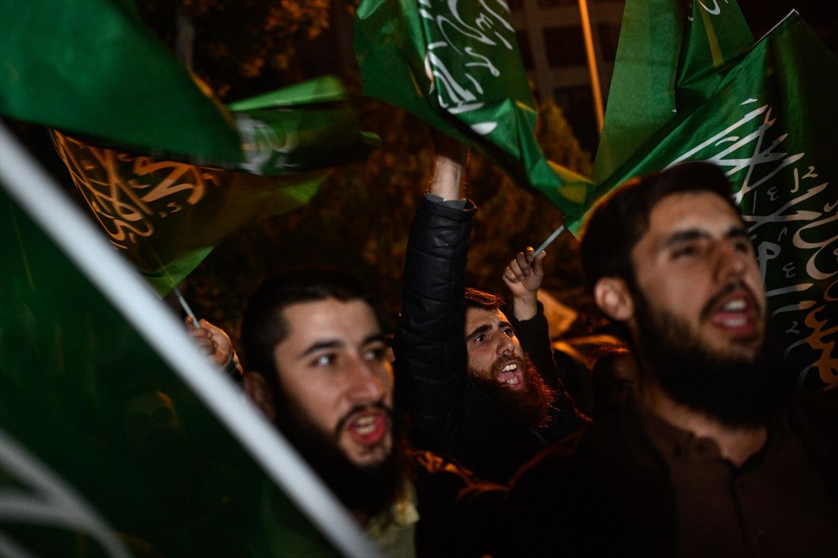Filistin bayrakları ve pankartlarla gösteriye katılanlar, saldırıya tepki göstererek İsrail karşıtı sloganlar attı.