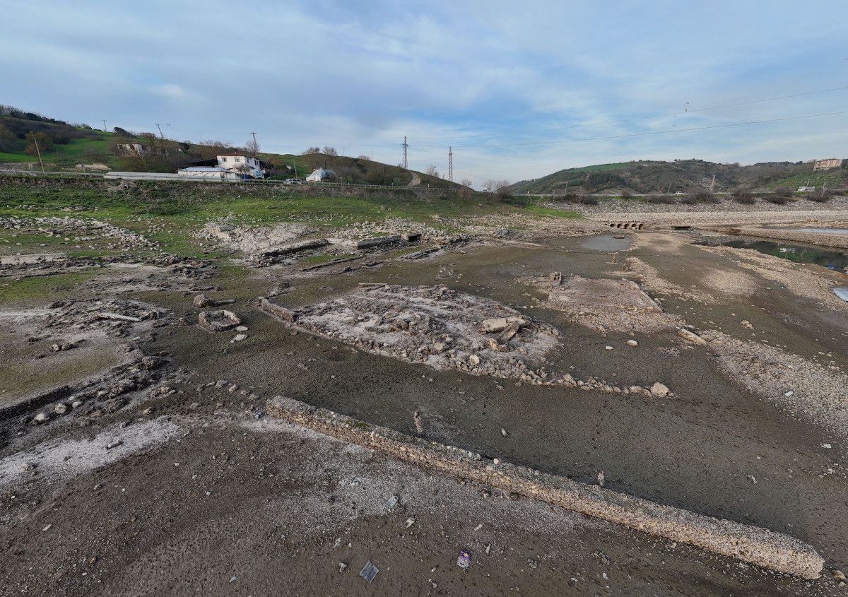 Su seviyesinin gerilemesiyle birlikte baraj sahasında daha önce su altında kalan eski köy evlerinin belirgin şekilde ortaya çıktığı görüldü.