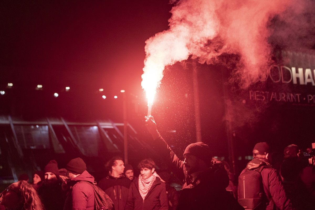 Ulusal basına yansıyan bilgi ve görüntülere göre, protestocular, “İsrail’e kırmızı kart göster” dövizi açarak, Gazze’de Filistinlilere karşı soykırım yapan İsrail’in spor müsabakalarından men edilmesini istedi.