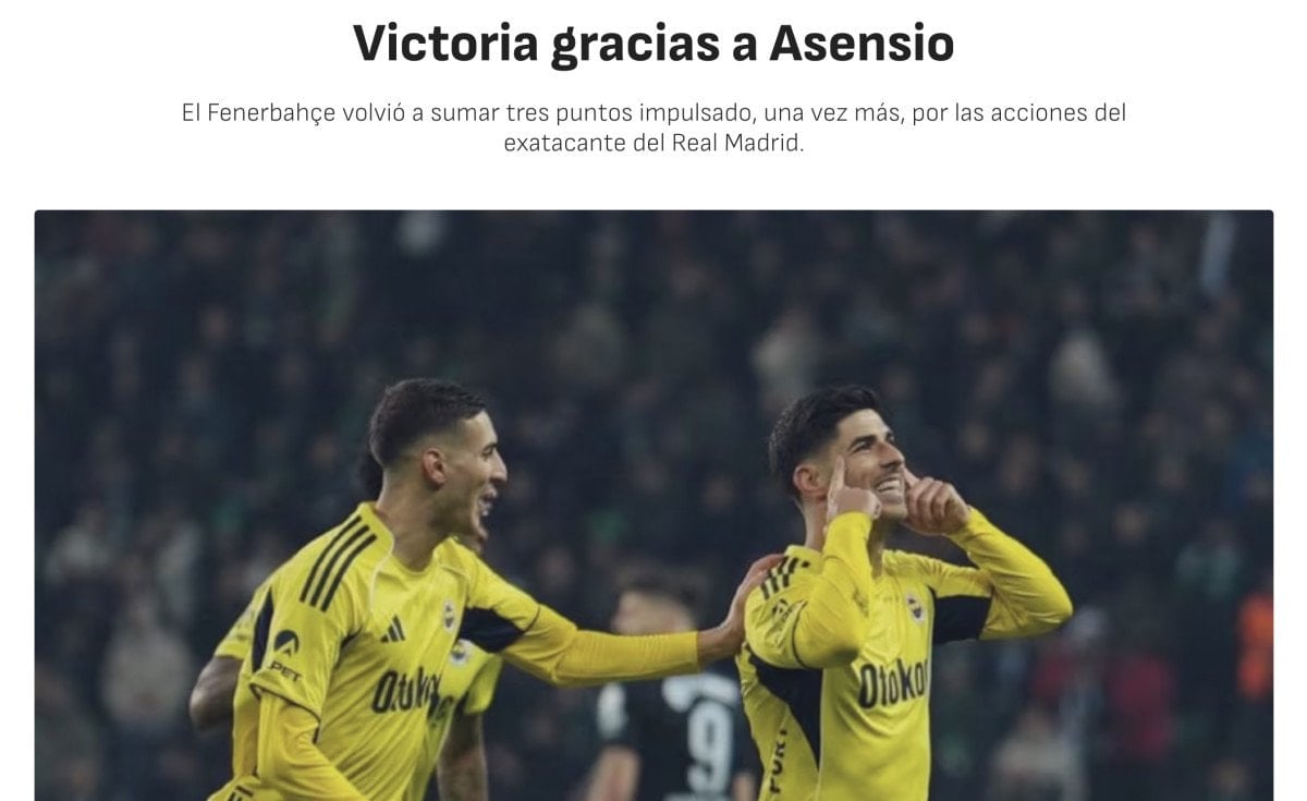 Asensio’nun harika bir performans sergilediği aktarılan haberde, “Asensio, Fenerbahçe’yi Kocaelispor karşısında 2-0’lık galibiyete taşıyan ve bu sezon çifte zafer elde etmesini sağlayan muhteşem bir gol attı.” denildi.