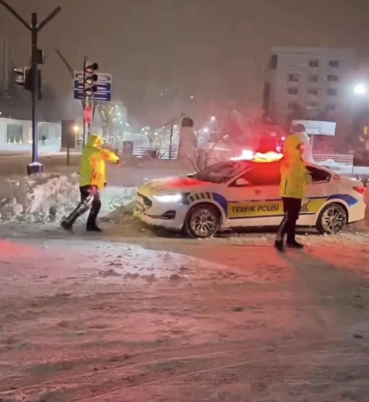 Trafik akışını kontrol etmek ve güvenliği sağlamak amacıyla sahada olan ekipler, çocukların kendilerine kar topu atmasıyla oyuna dahil oldu.
