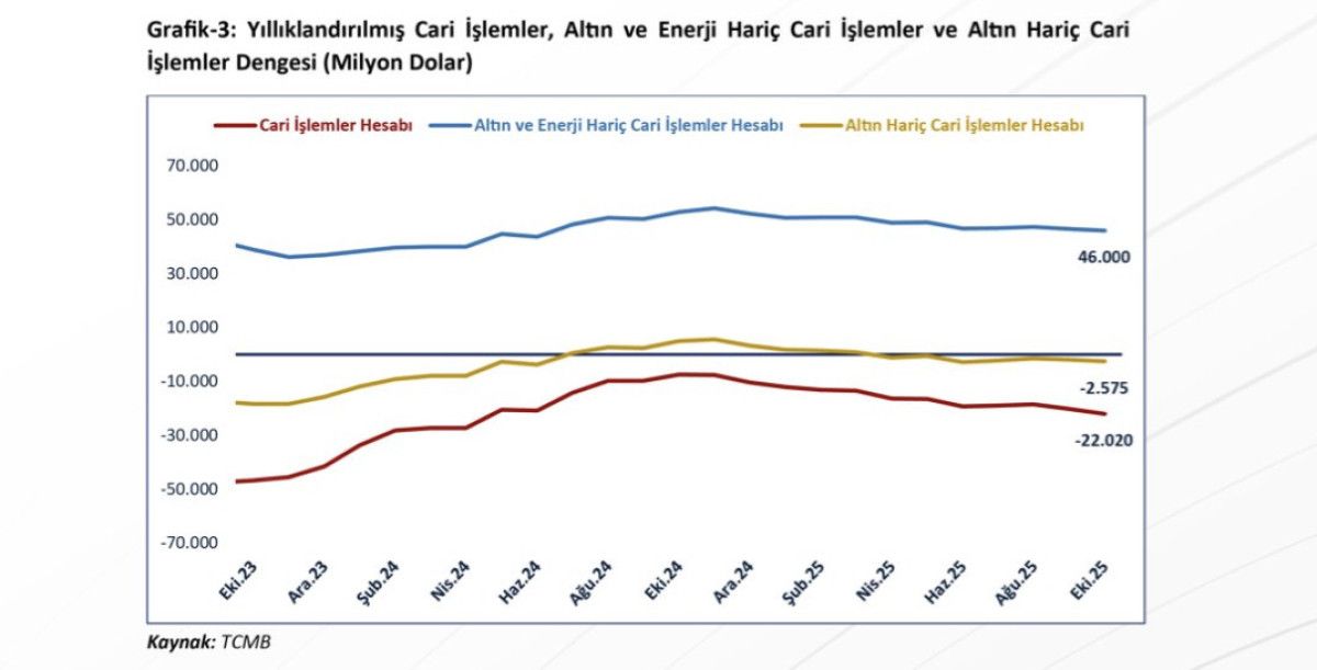 2025 yılı Ekim ayı altın hariç cari işlemler hesabında 3 milyar 201 milyon dolar fazla verilmiştir.