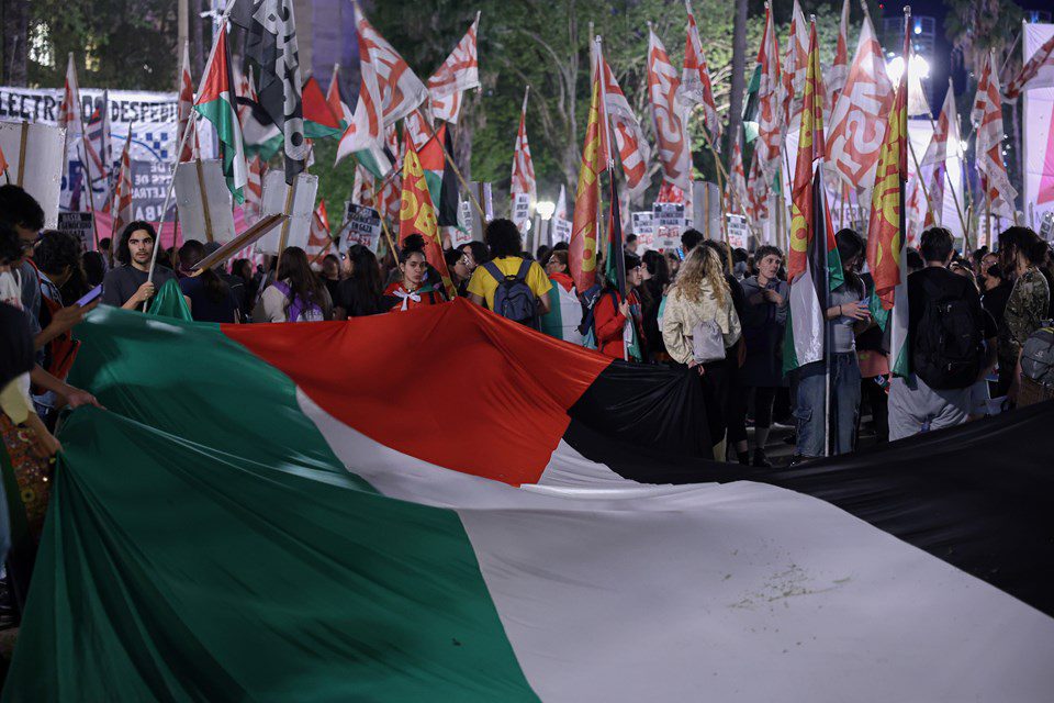 Arjantin’in başkenti Buenos Aires’te sosyal hareketler ve insan hakları örgütleri, İsrail’in Küresel Sumud Filosu’na yönelik askeri müdahalesini kınamak için yürüyüş düzenledi. Göstericiler, Plaza de Mayo’da hükümet binası önünde toplandı ve daha sonra İsrail Büyükelçiliği önüne yürüdü.