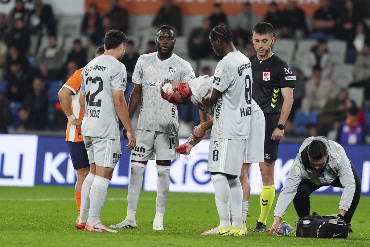 Saha içinde yapılan ilk tedavi sırasında 34 yaşındaki futbolcunun kafasına dikiş atıldı.