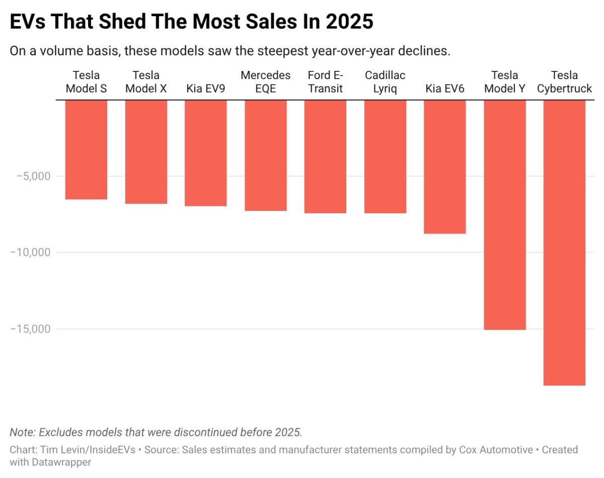 Cox Automotive verilerine göre araç, tüm elektrikli modeller arasında hacim bazında en sert düşüşü kaydeden model oldu.