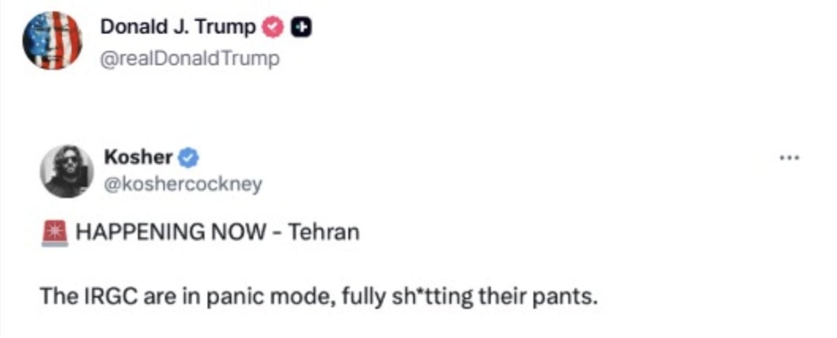 Trump’ın paylaşımında “Devrim Muhafızları Ordusu panikte. Tam olarak altlarına yapıyorlar” ifadeleri yer aldı.
