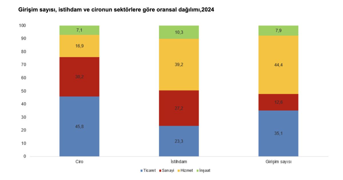 Geçici sonuçlara nazaran, 2024’te aktif teşebbüslerin yüzde 44,4’ü hizmet, yüzde 35,1’i ticaret kesiminde yer aldı.
