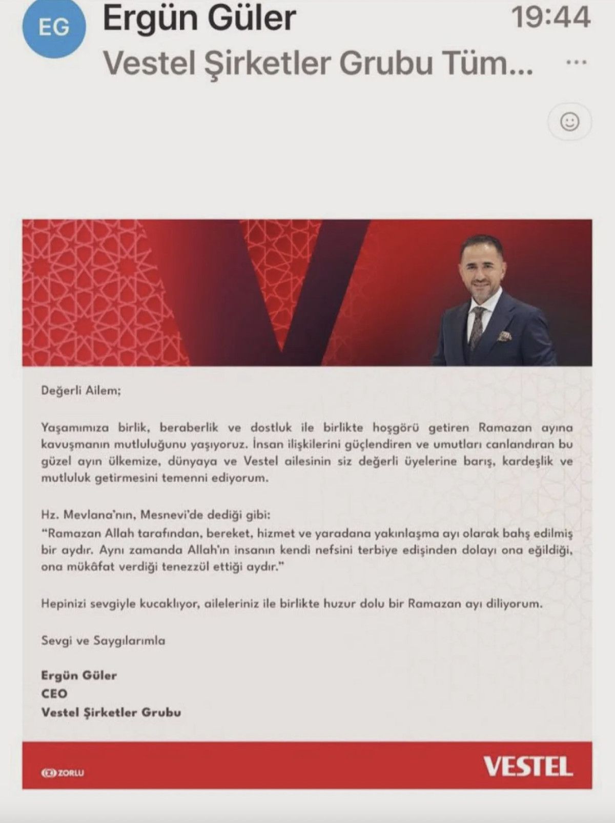 Vestel CEO’su Ergün Güler, Ramazan’ın başlaması nedeniyle çalışanlarına e-posta gönderdi.