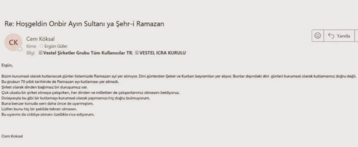 Bizim kurumsal olarak kutlanacak günler listemizde Ramazan ayı yer almıyor. Dini günlerden Şeker ve Kurban bayramları yer alıyor. Bunlar dışındaki dini günleri kurumsal olarak kutlamamız yanlışsız değil. Bu kümenin 70 yıllık tarihinde de Ramazan ayı kutlaması yer almadı. Şirket olarak dinden bağımsız bir duruşumuz var. Çok uluslu bir şirket olmaya çalışırken her dinden ve milletten de çalışanlarımız olmasını bekliyoruz. Buna benzeri bahiste seni daha evvel de uyarmıştım. Lütfen bunun hiçbir halde tekrarı olmasın. Bu uyarımı da ciddiye almanı bilhassa rica ediyorum.